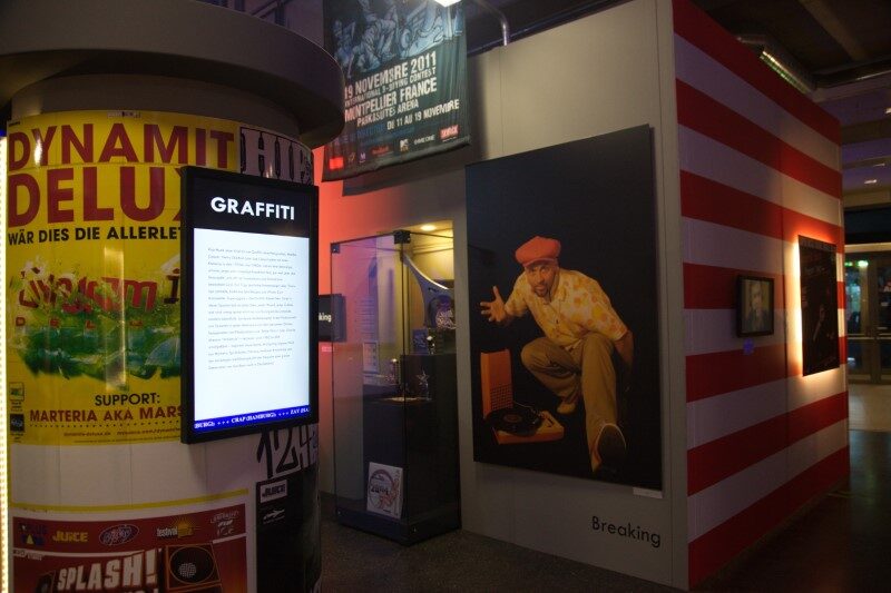 Zur Selbsterprobung der Besucher stehen ein DJ-Pult und eine großformatige Leinwand für virtuelles Graffitisprayen zur Verfügung.